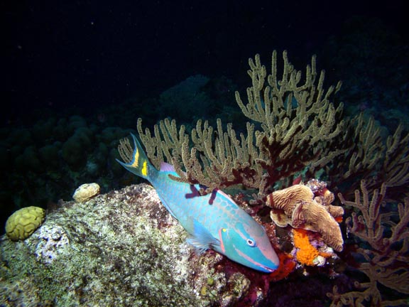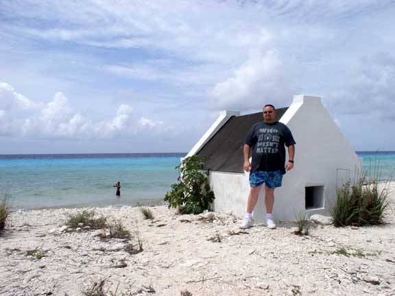 Well, well, well. What can I say? There's a reason that Bonaire is called the diver's paradise. There is more shore diving than can possibly be done in a week long vacation, especially when the diving at the resort's house reef was fantastic. We stayed at The Lion's Dive Resort and had a really great diving vacation. The staff at Bon Bini Divers couldn't have been any better, with 24 hour a day shore diving available. In the pictures, we have: the view from our front terrace (every night), me in front of a slave hut (imagine that), our first turtle, Sheila in front of a humongous pile of salt (oh yeah, she's in heaven), a parrotfish on a night dive and one of many moray eels that were present on just about every dive. If you are looking for a diving vacation with very little night life, then this is the place. You will find all the diving and peace and quiet you want but none of the Cancun style party atmosphere. Speaking of which, that's our next trip where our friends Mark and Angie and our daughter Angie will be joining us.